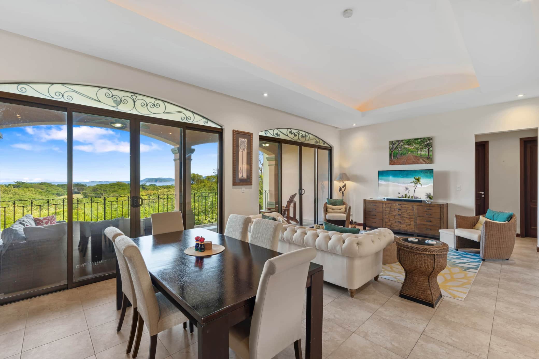 The open-plan living area features vaulted ceilings, large glass doors, and tropical light. A comfy sofa set faces a smart TV and leads to a spacious ocean-view terrace. The dining area seats six - perfect for family dinners or sunset wine.